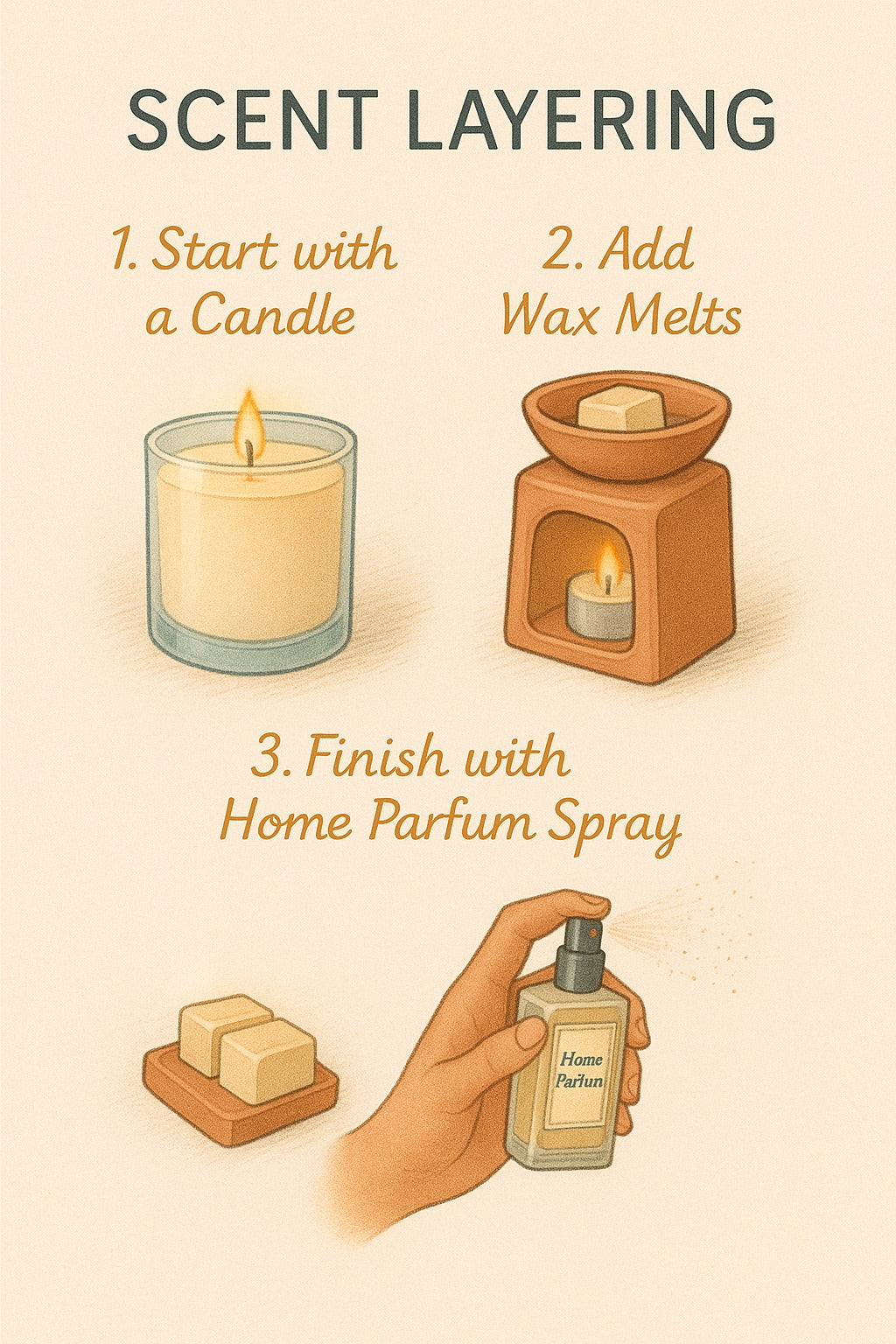 Start with a candle to anchor the room. This is your foundation scent—the steady, warm base note that gently fills the space over time. Perfect for living rooms, entryways, or a calming bedtime vibe.